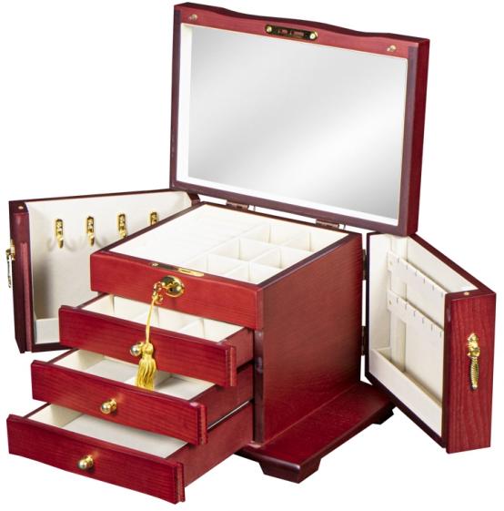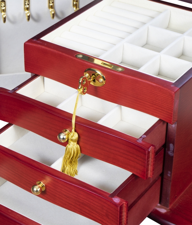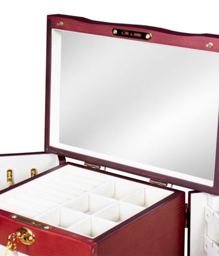 Использование приятного бархата в интерьере белого оттенка не оставит вас быть равнодушными. Раскрывающиеся в бок ящики позволят с удобством расположить в них разные подвески и колье. В дополнительных выдвижных трех ящиках можно хранить любые ювелирные аксессуары.