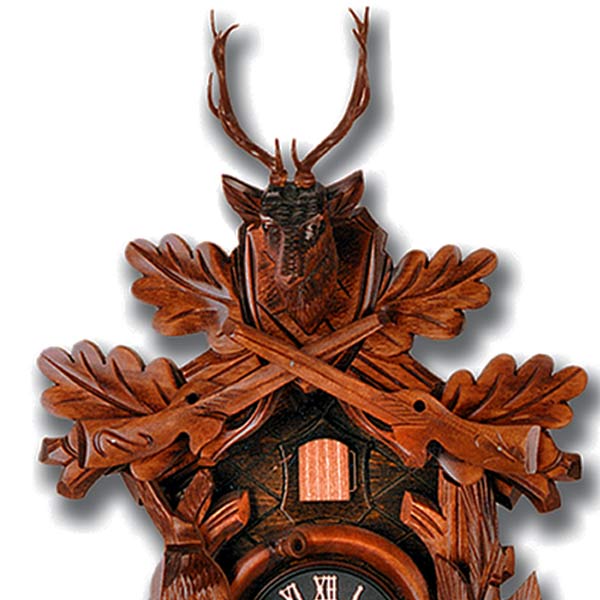 Часы с кукушкой SARS 0731-90 (Германия) имеют надежный механический немецкий механизм и безупречное качество сборки и производства. Филигранная резьба на тему охоты. Фасад украшен резными атрибутами, трофеями охотника. Циферблат обрамляет охотничий горн. Низ часов украшает сумка охотника. Фасад украшают дубовые листья, по бокам расположены подстреленные заяц и тетерев. В верхней части на фасаде расположена большая фигура оленя в перекрестии ружий на дубовых ветвях.