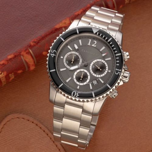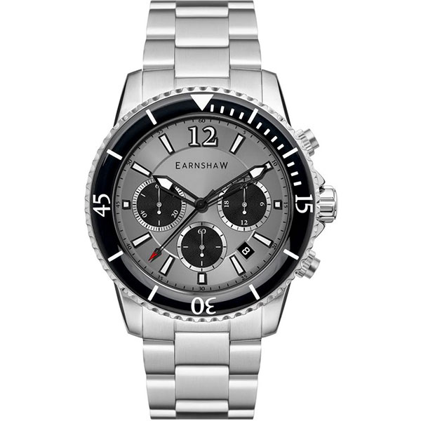 Мужской кварцевый хронограф. Центральные часовая и минутная стрелки, секундная стрелка вынесена на малый циферблат. Апертура даты между 4 и 5 часами. 12/24х часовой формат времени. Серый циферблат. Круглый корпус выполнен из нержавеющей стали. Диаметр корпуса составляет 43 мм, толщина 13 мм. Заводная головка с защитой. Стальной браслет, раскладывающаяся застежка. Прочное минеральное стекло устойчивое к мелким механическим повреждениям. Водостойкость WR 100 (плавание без погружения).