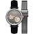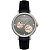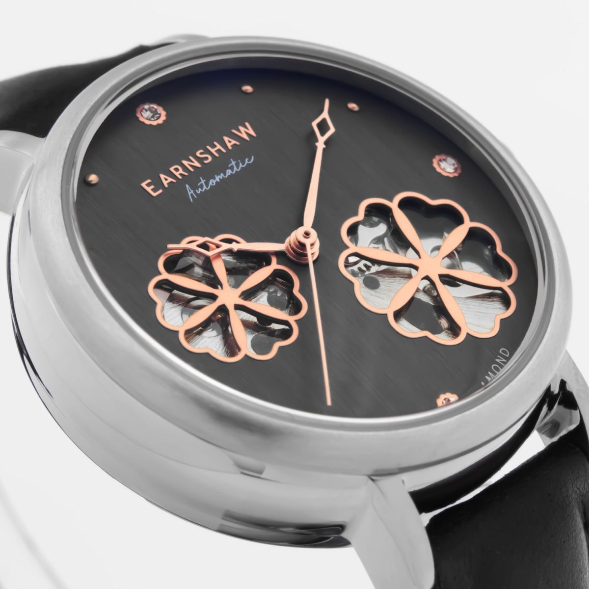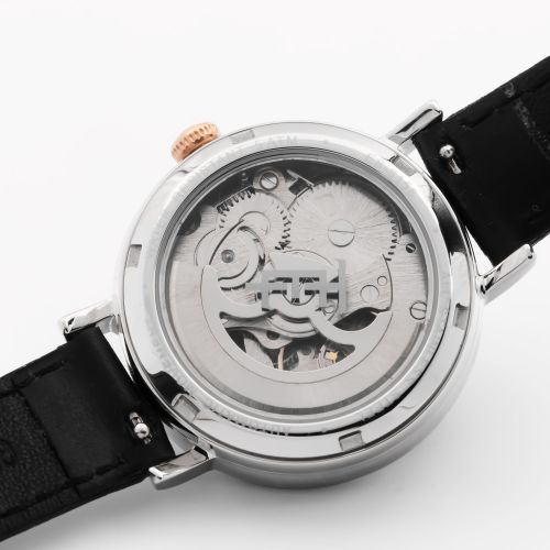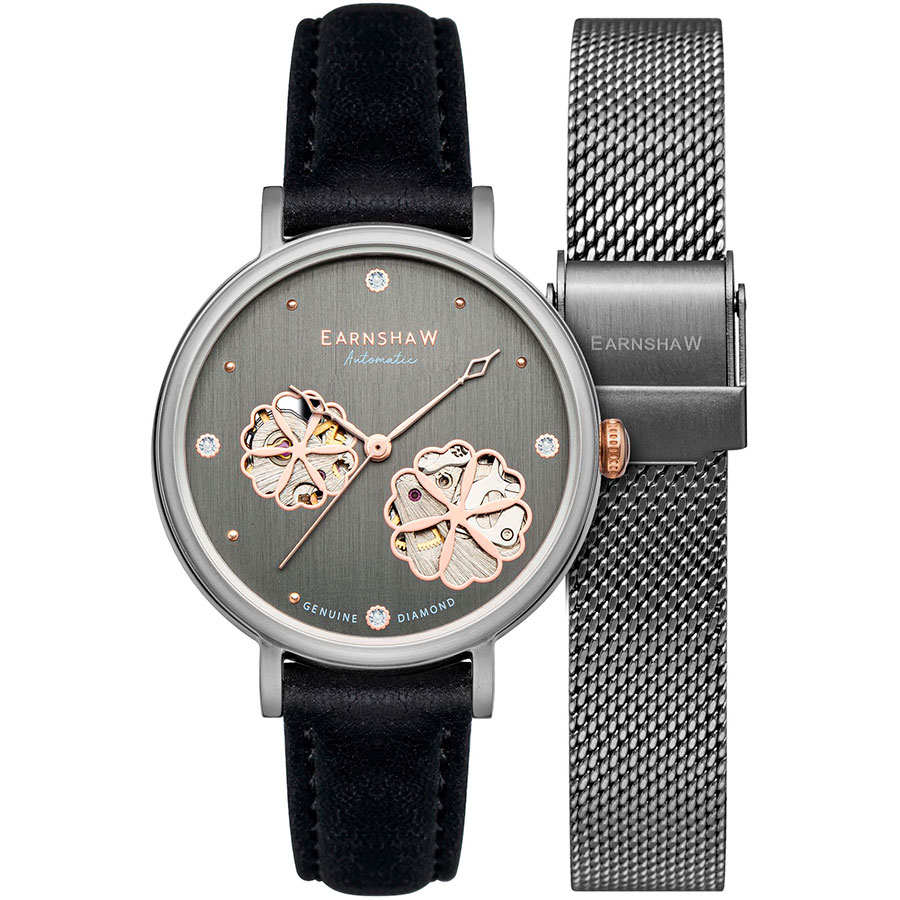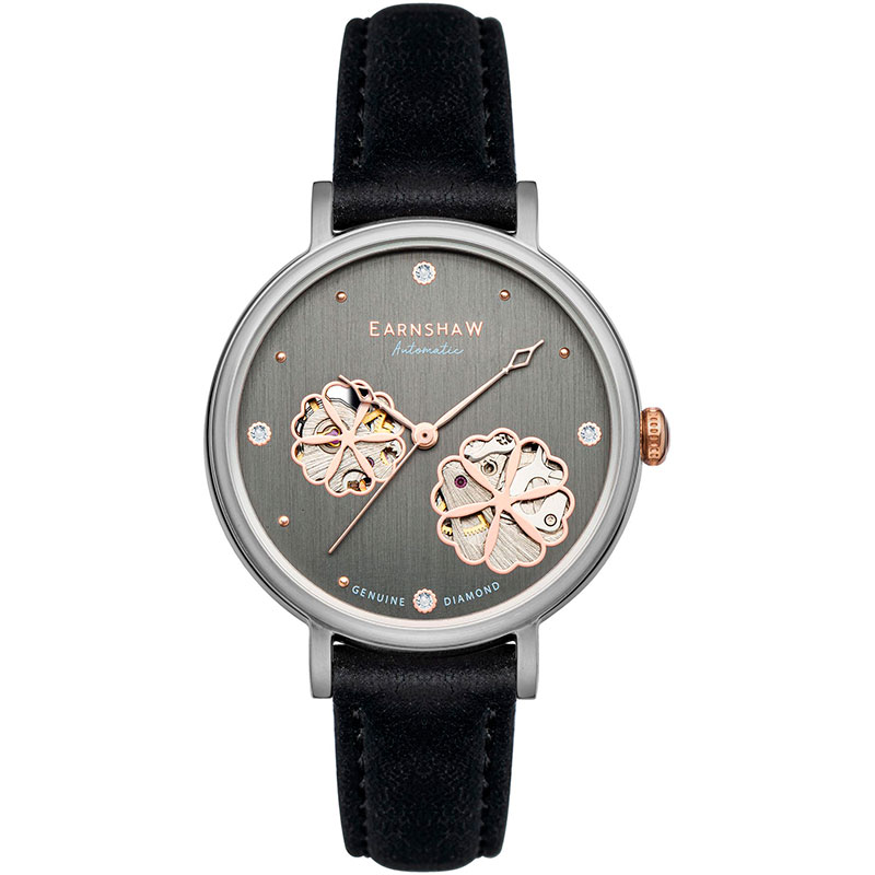 Женские механические часы с автоподзаводом. Центральные часовая, минутная и секундная стрелки. Серый циферблат с открытым балансом хода украшен бриллиантами. Круглый корпус выполнен из нержавеющей стали. Черный кожаный ремешок, стандартная застежка. Прочное минеральное стекло устойчивое к мелким механическим повреждениям. Водостойкость WR 50 (мытье рук, дождь). В комплекте стальной браслет миланского плетения.
