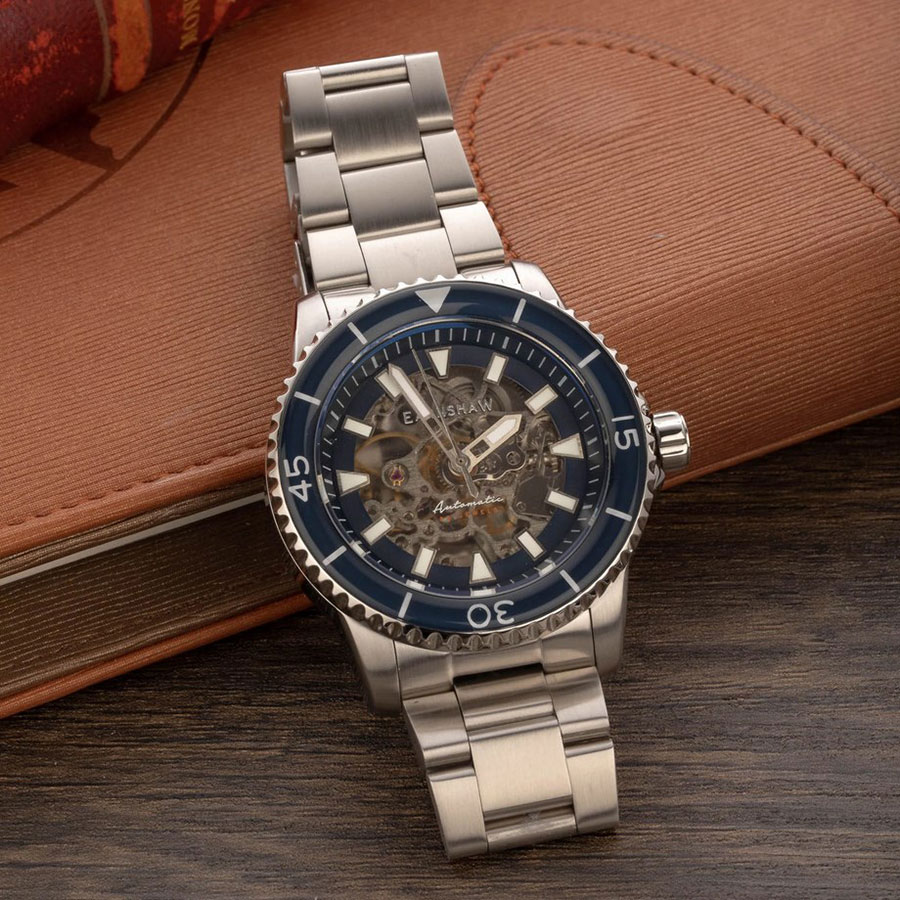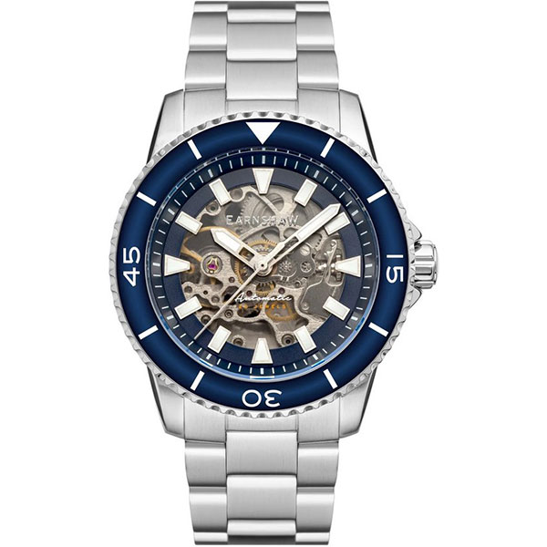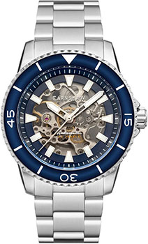 Мужские механические часы с автоподзаводом. Центральные часовая, минутная и секундная стрелки. Синий скелетонизированный циферблат. Круглый корпус выполнен из нержавеющей стали. Диаметр корпуса составляет 42 мм, толщина 14 мм. Заводная головка с защитой. Стальной браслет шириной 22 мм, раскладывающаяся застежка. Прочное минеральное стекло устойчивое к мелким механическим повреждениям. Прозрачная задняя крышка. Водостойкость WR 100 (плавание без погружения).