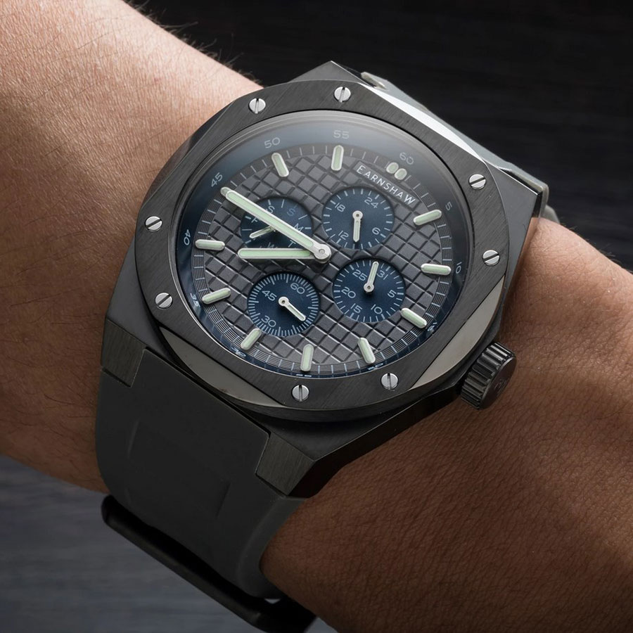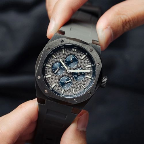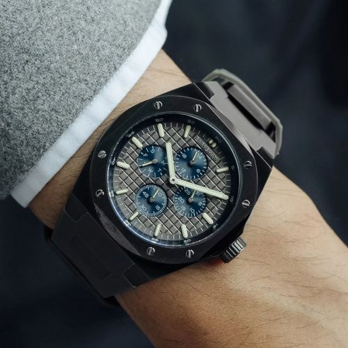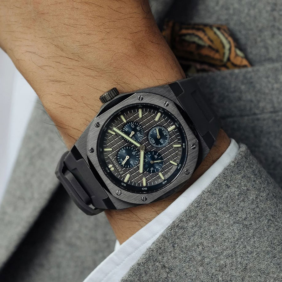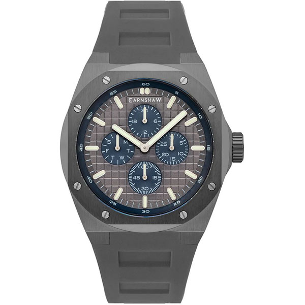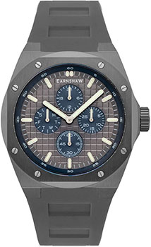 Мужские кварцевые часы. Центральные часовая и минутная стрелки, секундная стрелка вынесена на малый циферблат. Отображение даты и дня недели в малых циферблатах. 12/24х часовой формат времени. Серый циферблат. Корпус выполнен из нержавеющей стали с серым IP покрытием. Диаметр корпуса составляет 44 мм, толщина 14 мм. Серый силиконовый ремешок, стандартная застежка. Прочное минеральное стекло устойчивое к мелким механическим повреждениям. Водостойкость WR 100 (плавание без погружения).