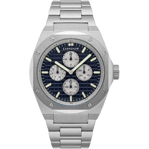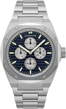 Мужские кварцевые часы. Центральные часовая и минутная стрелки, секундная стрелка вынесена на малый циферблат. Отображение даты и дня недели в малых циферблатах. 12/24х часовой формат времени. Синий циферблат с белыми элементами. Корпус выполнен из нержавеющей стали. Диаметр корпуса составляет 44 мм, толщина 14 мм. Стальной браслет, раскладывающаяся застежка. Прочное минеральное стекло устойчивое к мелким механическим повреждениям. Водостойкость WR 100 (плавание без погружения).