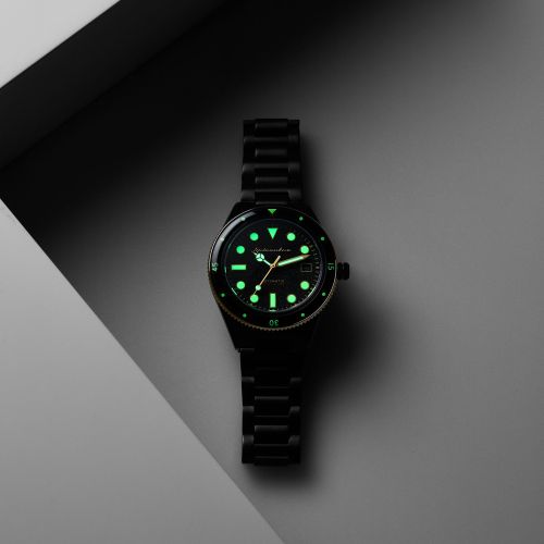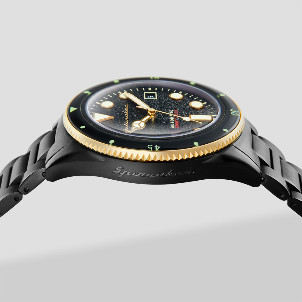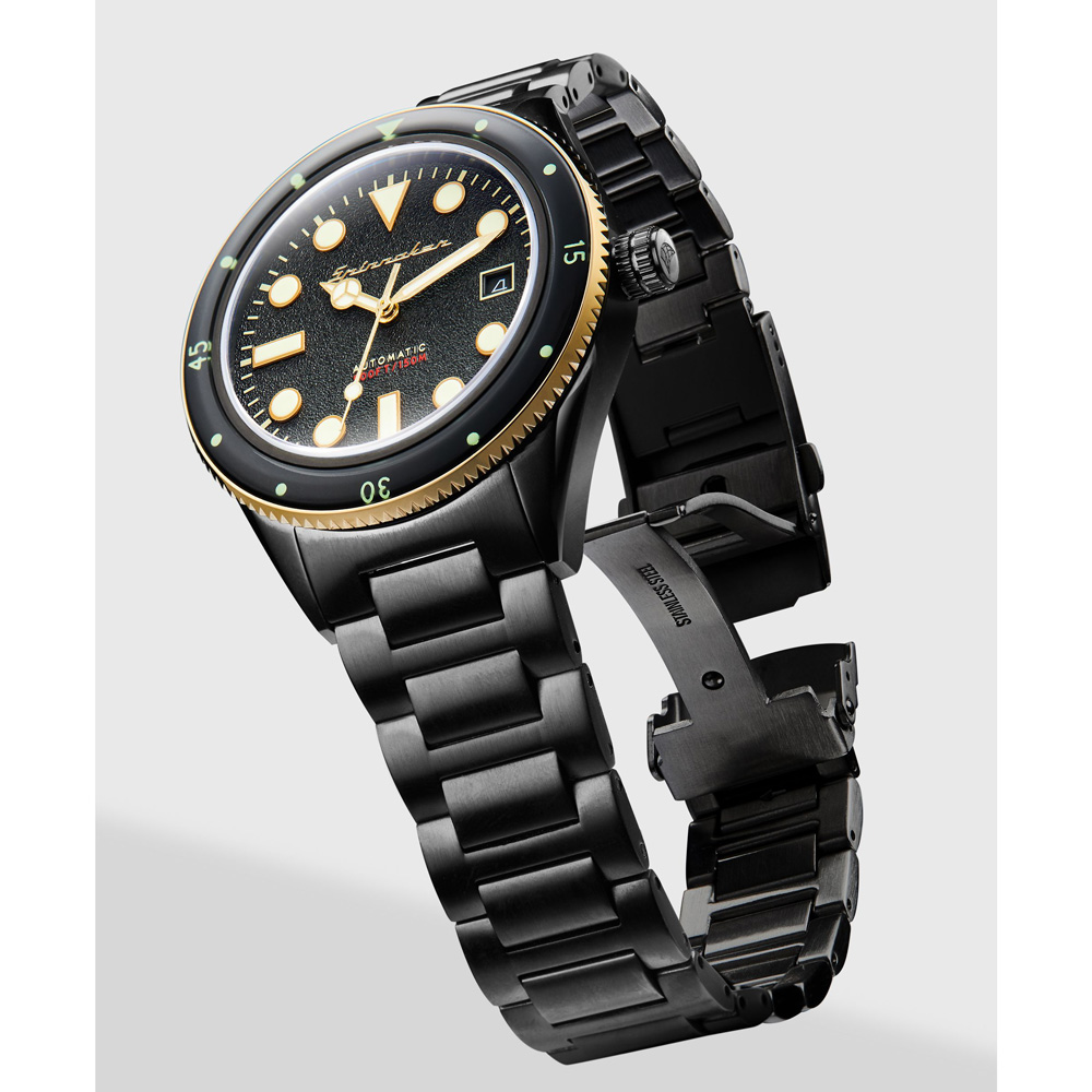 Мужские механические часы с автоподзаводом. Калибр механизма Miyota 8215. Запас хода 40 часов. Центральные часовая, минутная и секундная стрелки. Апертура даты в позиции 3 часов. Черный циферблат. Люминисцентные стрелки и метки. Круглый корпус выполнен из нержавеющей стали 316L с черным IP покрытием. Диаметр корпуса составляет 40 мм, толщина 13 мм. Стальной браслет с покрытием шириной 20 мм, раскладывающаяся застежка. Устойчивое к возникновению царапин сапфировое стекло с антибликовым покрытием. Водостойкость WR 150. Вес примерно 100 гр.