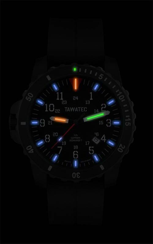 Противоударные military часы TAWATEC Black Titan DiverTWT.96.86.11T выполнены из титана и имеют сапфировое стекло с антибликовым покрытием. Заводная головка расположена с левой стороныкорпуса напротив деления "9". Эта модель противоударных military часоввыпускается на каучуковом ремешке с тактической подсветкой на основе трития.