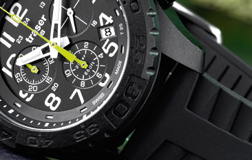 Часы Traser Outdoor Pioneer Chronograph помимо материала исполнения корпуса обладают еще одной уникальной особенностью – подсветкой даты. Тритиевая вставка тригалайт расположена непосредственно под окошком даты. В темноё время суток подсветка даёт возможность без проблем считывать дату в часах. Данная технология подсветки в часах применена впервые. Как и во всех часах Traser H3 watches, в новой модели установлена тритиевая подсветка всех стрелок и циферблата зеленого цвета. Так что «Пионеры» ночью не заблудятся. В сочетании с доступной ценой эта модель уже заняла верхнюю строчку в рейтинге по популярности среди часов для профессионалов, которые не подведут в самой сложной ситуации.