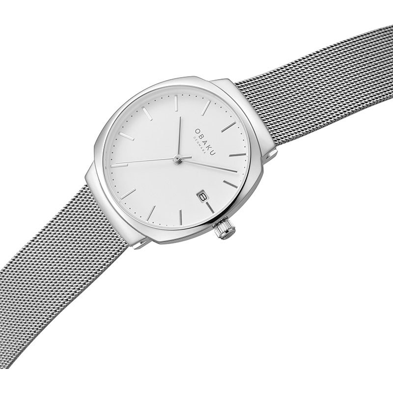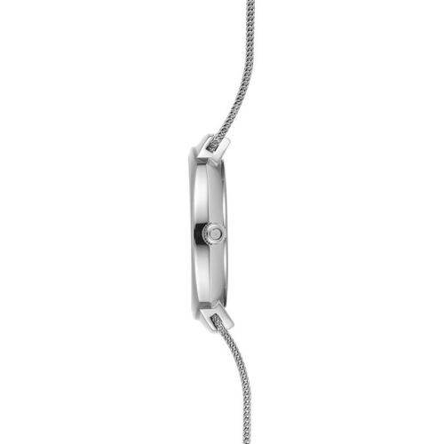 Женские кварцевые часы. Центральные часовая, минутная и секундная стрелки. Апертура даты в позиции 3 часов. Белый циферблат. Круглый корпус выполнен из нержавеющей стали. Диаметр корпуса составляет 33 мм. Стальной браслет выполнен в технике миланского плетения, раскладная застежка. Прочное минеральное стекло устойчивое к мелким механическим повреждениям. Водостойкость WR 30 (брызги).